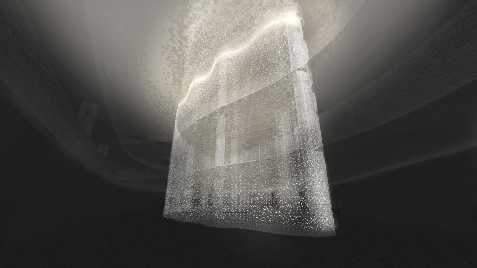 贯穿三层挑空空间的 15 米高波浪形玻璃装置,